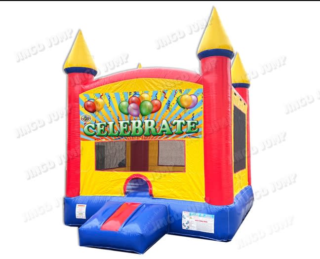 Bring the fun with the 13' Celebrate Castle Bouncer. This inflatable measures 13′ L x 13′ W x 15′ H and creates a safe, roomy play space for kids. The removable "celebrate" banner adds festive style. An open mesh roof provides airflow and full visibility. A built-in basketball hoop increases active play.. Serving Rains and Hunt County plus surrounding areas. 🚚