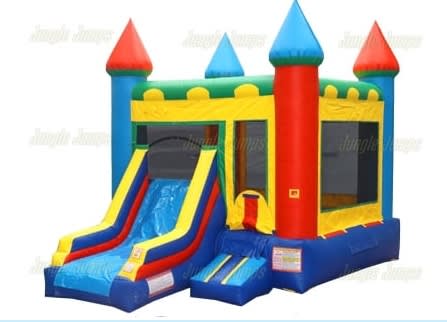 Standard size 13x13 bounce castle with slide. This 13 x 19 x 15 castle-themed unit fits all ages. It offers gender-neutral colors, and a safe play surface. Ideal for backyard parties, school events, and community fairs.
